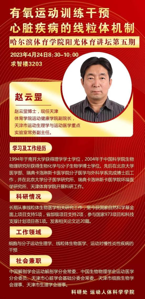 4月24日上午8:30时,阳光体育讲坛活动在求智楼顺利进行。本期讲坛由科研处和运动人体科学学院联合主办,邀请了天津体育学院运动健康学院副院长、天津市运动心理学与运动医学重点实验室常务副主任赵云罡教授进行题为《有氧运动训练干预心脏疾病的线粒体机制》的讲座;下午14时,赵云罡教授与运动人体科学学院教师代表进行座谈,深度探讨“体育+”科研方向,并对实验室建设等相关问题进行指导。