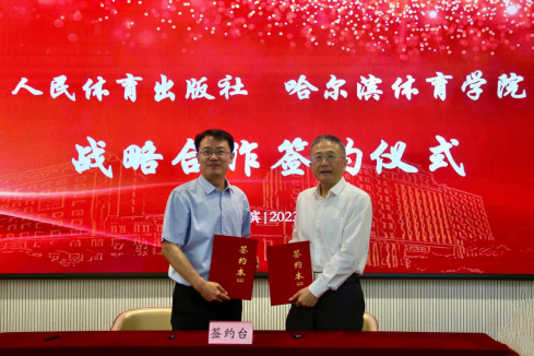 人民体育出版社社长王良玉与哈尔滨体育学院院长陈德明共同签署《战略合作框架协议》。