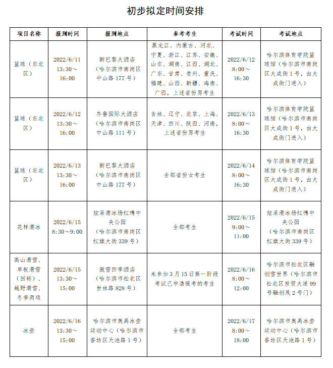 各位考生: 我校拟定于6月12日-6月17日进行篮球(东北区)、花样滑冰(全国)、冰壶(全国)和高山滑雪、单板滑雪回转、越野滑雪、冬季两项(全国,未参加3月15日第一阶段考试已申请缓考的考生)考试。 为便于考试安排,请广大考生主动了解哈尔滨市及自身所处地区防疫政策,并于5月27日18:00前登录中国运动文化教育网、体教联盟APP进入体育单招报名管理系统完成考生相关健康信息填报,并从报到前14天开始,每日中午12:00前如实进行每日健康信息填报。 请广大考生相互告知,不要错过信息填报时间。最终考试时间将根据信息摸排及疫情变化情况确定,以我校公布的考生报到须知为准,请各位考生及时关注相关信息。