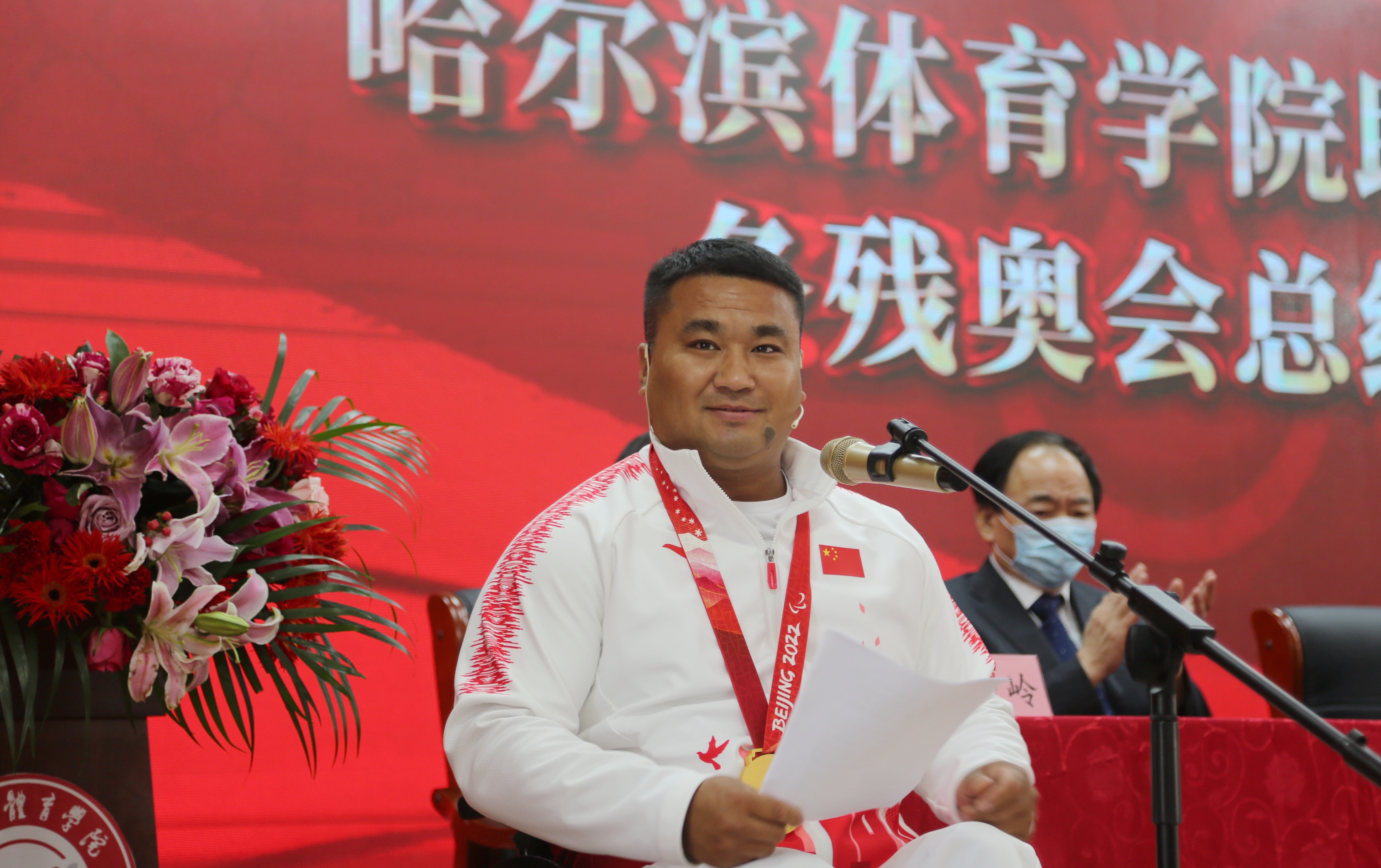冬季奥林匹克学院教师、中国轮椅冰壶队队长王海涛同志,代表全体运动员上台发言