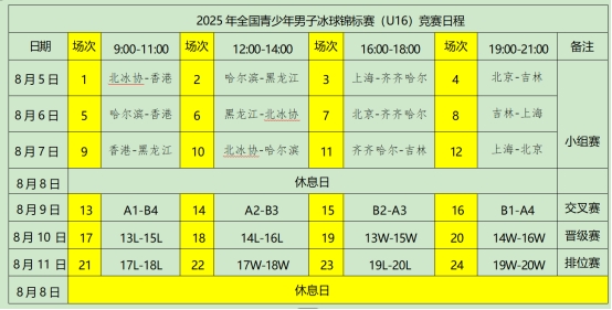 2025年8月5日9点,由中国冰球协会主办,哈尔滨名将体育发展有限公司承办,哈尔滨体育学院协办的2025年全国青少年男子冰球锦标赛(U16)开幕式在哈尔滨体育学院大学生滑冰馆隆重举行。共有北京队、北京冰协队、哈尔滨队、黑龙江队、吉林队、齐齐哈尔队、上海队和香港队共计8支队伍,进行为期6天的激烈争夺。中国冰球协会副主席杨永生、黑龙江省体育局党组成员副局长董晓冬、哈尔滨体育学院党委副书记王春雷、中国冰球协会竞赛部技术总监张寒松、黑龙江省冰球协会主席邹亚昌、哈尔滨市冬季运动项目训练中心主任赵亮、哈尔滨市香坊区文化体育和旅游局局长王育红、哈尔滨名将体育发展有限公司赵树峰出席开幕式。