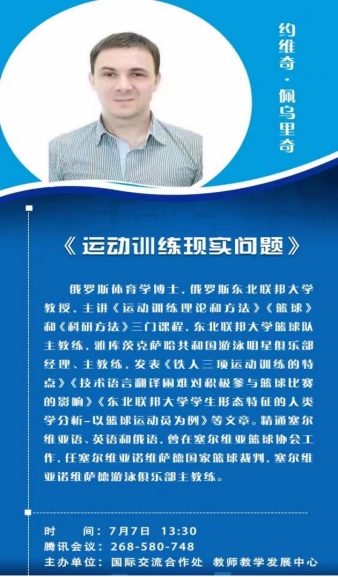 7月7日下午1点30分,国际交流合作处联合教师教学发展中心邀请约维奇·佩乌里奇教授进行线上学术讲座,主题为《运动训练现实问题》。讲座由教师教学发展中心张彦秋副主任主持。