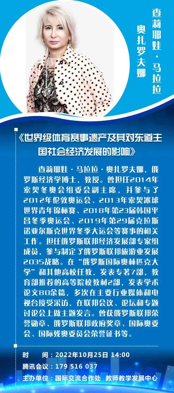 国际交流合作处邀请我校客座教授、俄罗斯经济学博士查莉耶娃·马拉拉·奥扎罗夫娜,联合教师教学发展中心于2022年10月25日下午2点为我校师生进行线上讲座。讲座主题为《世界级体育赛事遗产及其对东道主国社会经济发展的影响》。本次讲座由教师教学发展中心副主任张彦秋主持,我校教师,博士、硕士研究生近200人参加了本次会议。
