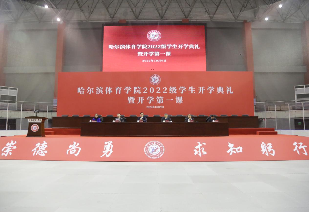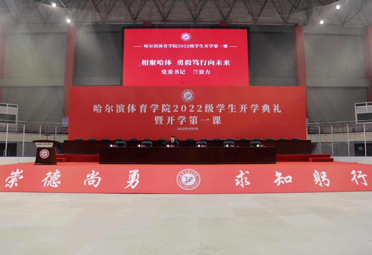 寒露至,秋意浓。10月9日上午,哈尔滨体育学院2022级新生开学典礼暨开学第一课隆重举行。校党委书记兰景力,校长陈德明,校党委副书记姜玉洪,副校长王金满,校纪委书记那贵玲,校工会主席赵俊岭,学校机关部处、教辅及直属单位主要负责人,各学院党总支书记、院长、党总支副书记,全体辅导员;各年级学生代表共同参加了此次盛会。学生家长与未能如期返校的学生通过在线直播的方式参加典礼。典礼由党委副书记姜玉洪主持。