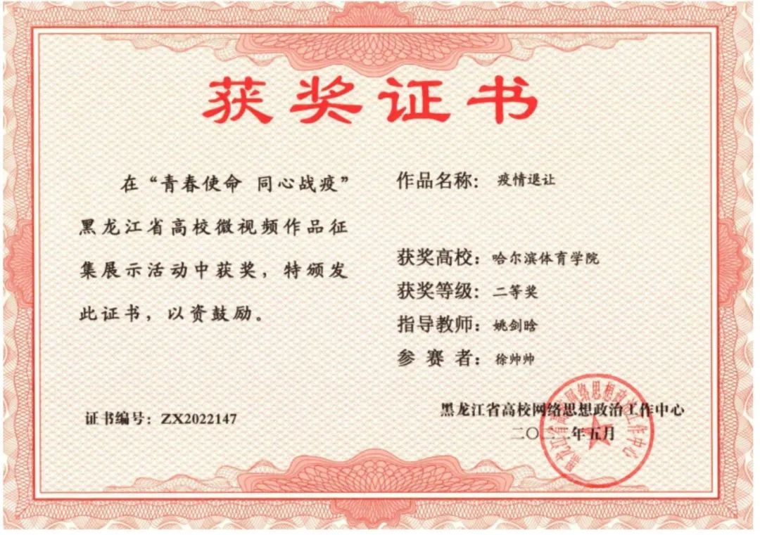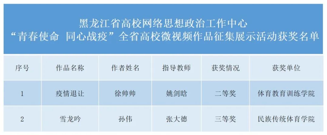 在“黑龙江省高校网络思想政治工作中心‘青春使命 同心战疫’全省高校微视频作品征集展示活动”中,我校师生获得2项等级奖: