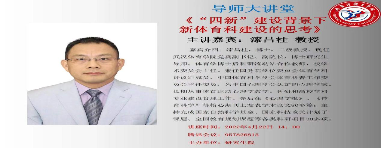 2022年4月22日下午,研究生院在尚德楼学术报告厅举办了导师大讲堂活动,以《“四新”建设背景下新体育科建设的思考》为题进行了专题学术讲座,讲座采用线上与线下结合的方式进行。