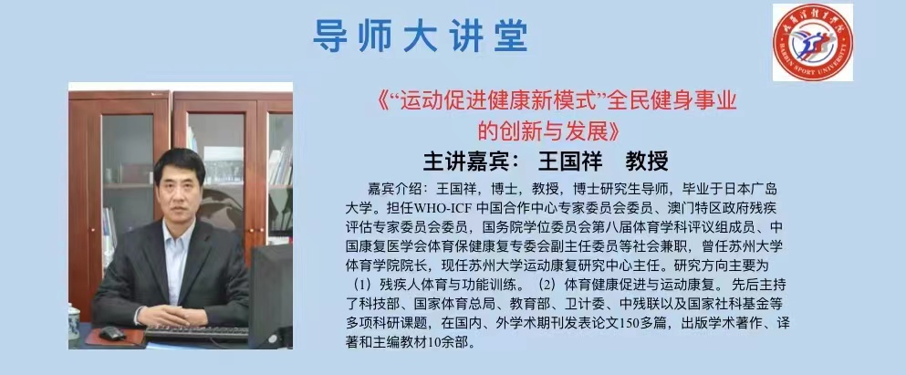 王国祥教授以《“运动促进健康新模式”全民健身事业的创新与发展》为题,从四个核心要素角度,向我们全面、系统、精准的描绘与解读了“运动促进健康新模式”。以习近平总书记提出的“推进健康关口前移,建立体育和卫生健康等部门协同、全社会共同参与的运动促进健康新模式”为引领,积极创新与发展全民健身事业,构建“运动促进健康新模式”。