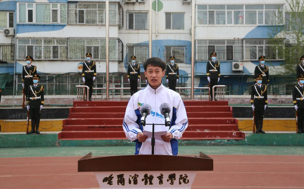 体育教育训练学院2020级李瑞作为团员青年代表发言。他讲到身为新时代的哈体青年,我们要更加紧密地团结在以习近平同志为核心的党中央周围,全面贯彻习近平新时代中国特色社会主义思想,勿忘昨天的苦难辉煌,无愧今天的使命担当,不负明天的伟大梦想,以史为鉴、开创未来,埋头苦干、勇毅前行,始终牢记总书记的殷殷教诲,秉承奥运精神、传承奥运基因,共同携手,承载奋斗之情、拼搏之志,以昂扬精神与进取之心为中国的冰雪运动贡献青春力量。