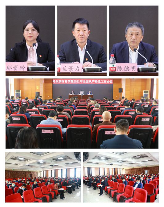 哈尔滨体育学院2021年全面从严治党工作会议,于2021年4月29日在尚德楼报告厅举行。校党委书记兰景力作重要讲话,纪委书记那贵玲作工作报告。党委委员、纪委委员、处级干部、辅导员共95人在主会场参会;科级干部以及学生工作部、财务处、国有资产管理处、人事处、招生就业处、后勤管理处、场馆管理中心全体人员共91人通过视频会议参会。会议由校党委副书记、校长陈德明主持。