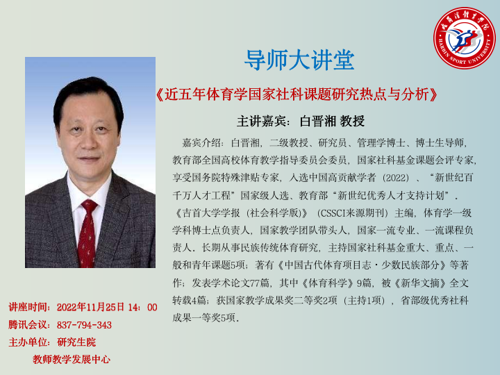 2022年11月25日下午,研究生导师大讲堂于尚德楼学术报告厅举行,本期导师大讲堂邀请的嘉宾是吉首大学白晋湘教授。哈尔滨体育学院党委副书记、校长陈德明主持讲座,研究生院院长杜春华、人事处处长张显峰、教师发展中心副主任张彦秋参加讲座。讲座采用线下与线上相结合的方式展开,参会人员为哈体博士生导师、硕士生导师和2022级全体博士、硕士研究生。
