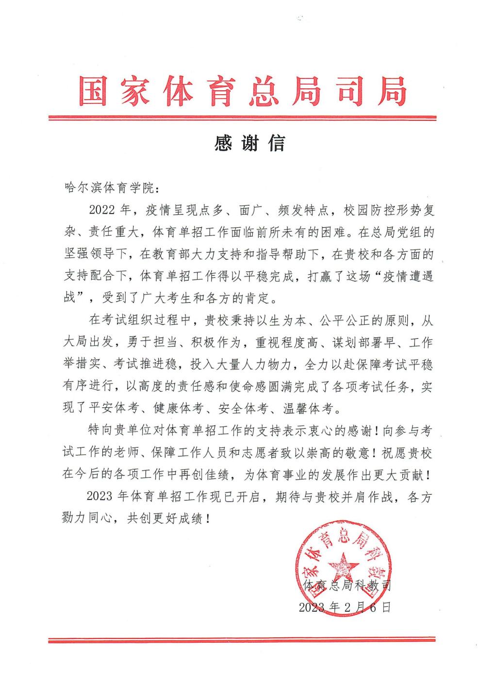 国家体育总局科教司向我校致感谢信