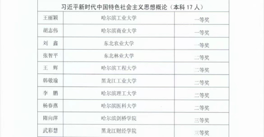 由黑龙江省教育厅、黑龙江省科教文卫体工会委员会联合举办主办的2022年黑龙江省高校思想政治理论课教师教学大赛,共评选出一等奖24项,二等奖35项,三等奖64项,评选结果现已公布。