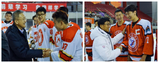 赛后,学校党委副书记、校长陈德明,哈尔滨学院体育学院院长李大威走上冰场与双方参赛队员亲切握手,表达亲切的问候和美好的祝福,并激励同学们弘扬冬奥精神,树立艰苦奋斗的精神,勇攀高峰,为我国的冰雪事业作贡献。