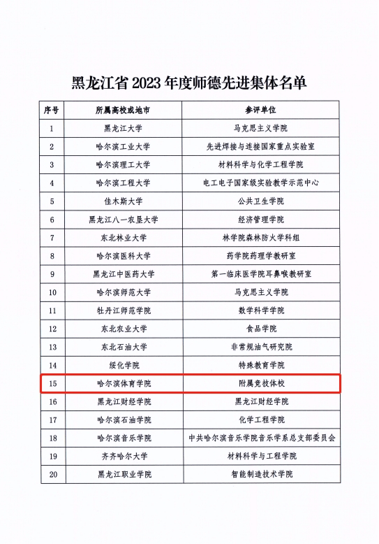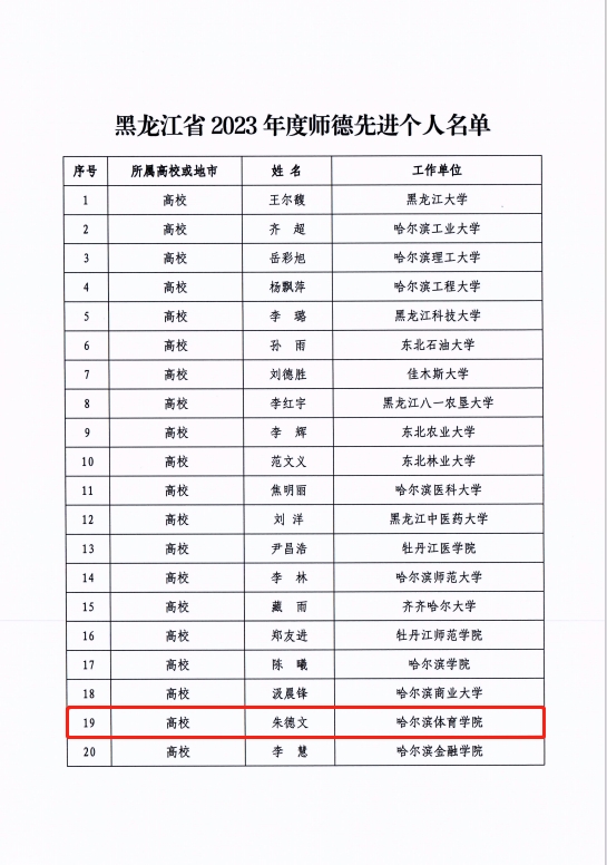 日前,省教育厅印发了《关于表彰2023年度全省师德先进集体和师德先进个人的决定》,哈尔滨体育学院附属竞技体校获师德先进集体荣誉称号,哈尔滨体育学院附属竞技体校教师朱德文获师德先进个人荣誉称号。