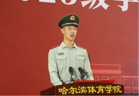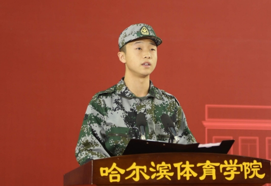 随后,军训旅学生代表体育艺术学院2023级1班张佳乐同学发言。他表示要以热情、毅力和决心去挑战自我,不负时代重托、不负党的期待、不负人民所望,让青春在军训中闪光,让青春在哈体绽放出绚丽之花。