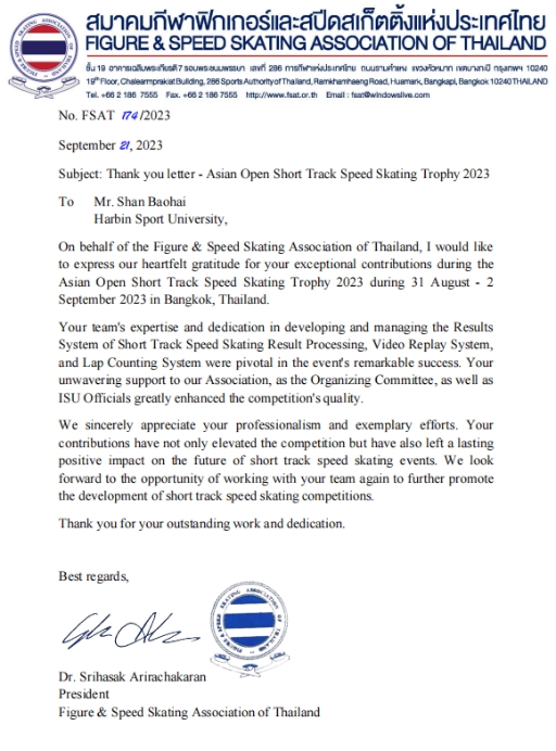 2023年亚洲短道速滑公开赛于9月2日在泰国曼谷顺利闭幕。学校体育科学研究院单保海教授团队经亚滑联技术委员会、国家体育总局冬季运动管理中心推荐、选派,为本次比赛提供了全面的赛事技术支持服务,保证了比赛的顺利举办。近日泰国花样滑冰和速度滑冰协会向单保海教授团队发来了感谢信,感谢单教授团队在赛事举办过程中的出色工作。