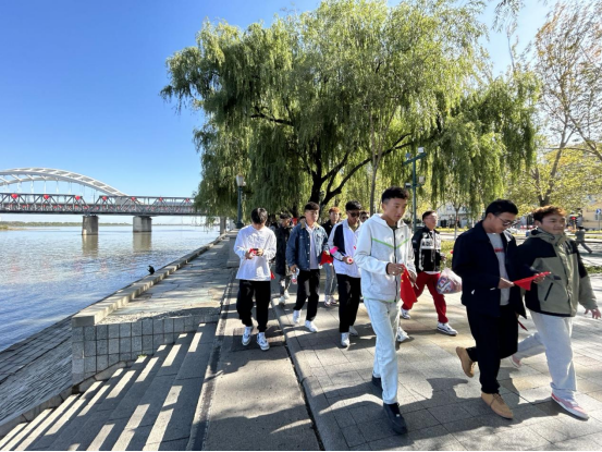 近50名学生精神抖擞,从松花江铁路大桥出发,徒步到防洪纪塔、哈尔滨城市规划展览馆。一路上红旗飘扬、欢歌笑语、步履铿锵,学生们相互交流,相互学习,观赏着徒步沿途的风景,感受着松花江畔的秋意时光,无人叫苦叫累。徒步活动既能培养吃苦耐劳精神,加强身体素质,又能培养团队意识、纪律意识,让同学们在徒步活动中收获成长,树立战胜困难的信心。