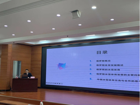 讲座中,赵围教授围绕俄罗斯概况、俄罗斯体育发展概述、俄罗斯的冰雪体育、俄罗斯冰雪体育发展的主要问题、中俄冰雪体育交流与合作的思考五个方面,详细论述了在中俄全面战略协作伙伴关系进入新时代之际,合理利用冰雪资源,共同提高中俄冬季项目竞技水平,加强中俄体育文化交流互动,不断促进中俄合作之花结出更多硕果是当前冰雪体育发展的重要任务。同时赵围教授指出中俄冰雪体育合作与交流应围绕服务冬奥战略、打造我校冰雪体育师资与教学的国内外制高点、拓宽大学生创新创业视野以及增进中俄青少年的“民心相通”与时代友好四个重要领域展开。
