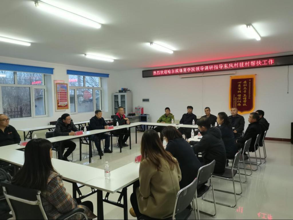 在东风村村委会会议室,赵俊岭主持召开了驻村帮扶工作座谈会,深入了解驻村工作队的工作生活情况、东风村集体经济及党的建设、村民收入等各方面情况,悉心听取与会同志对哈尔滨体育学院驻村帮扶工作的意见建议和相关诉求。赵主席表示,学校将一如既往地支持驻村帮扶工作,关注和支持东风村的发展建设,竭尽全力服务广大村民、为乡村振兴添砖加瓦,立足发挥冰雪特色办学优势,在资金、技术及教育培训等方面努力创建哈尔滨体育学院的帮扶品牌。