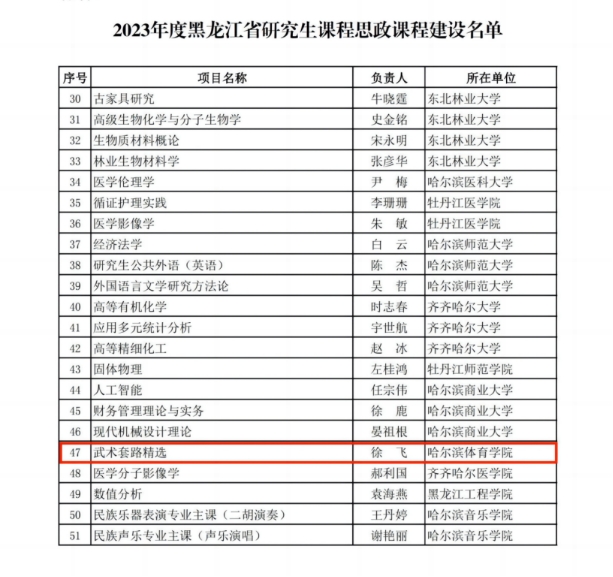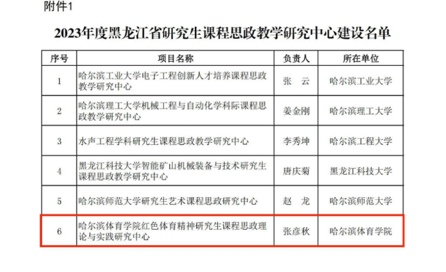 1月9日,黑龙江省教育厅下发通知,公布了2023年黑龙江省研究生课程思政高质量建设项目评审结果。省教育厅于2023年8月启动2023年度研究生课程思政建设项目申报工作。经各研究生培养单位遴选推荐,省教育厅委托省研究生课程思政建设联盟进行形式审查、组织省外高水平专家评审公示后,我校获批立项2023年黑龙江省研究生课程思政研究中心建设项目1个、研究生课程思政课程建设项目1个。