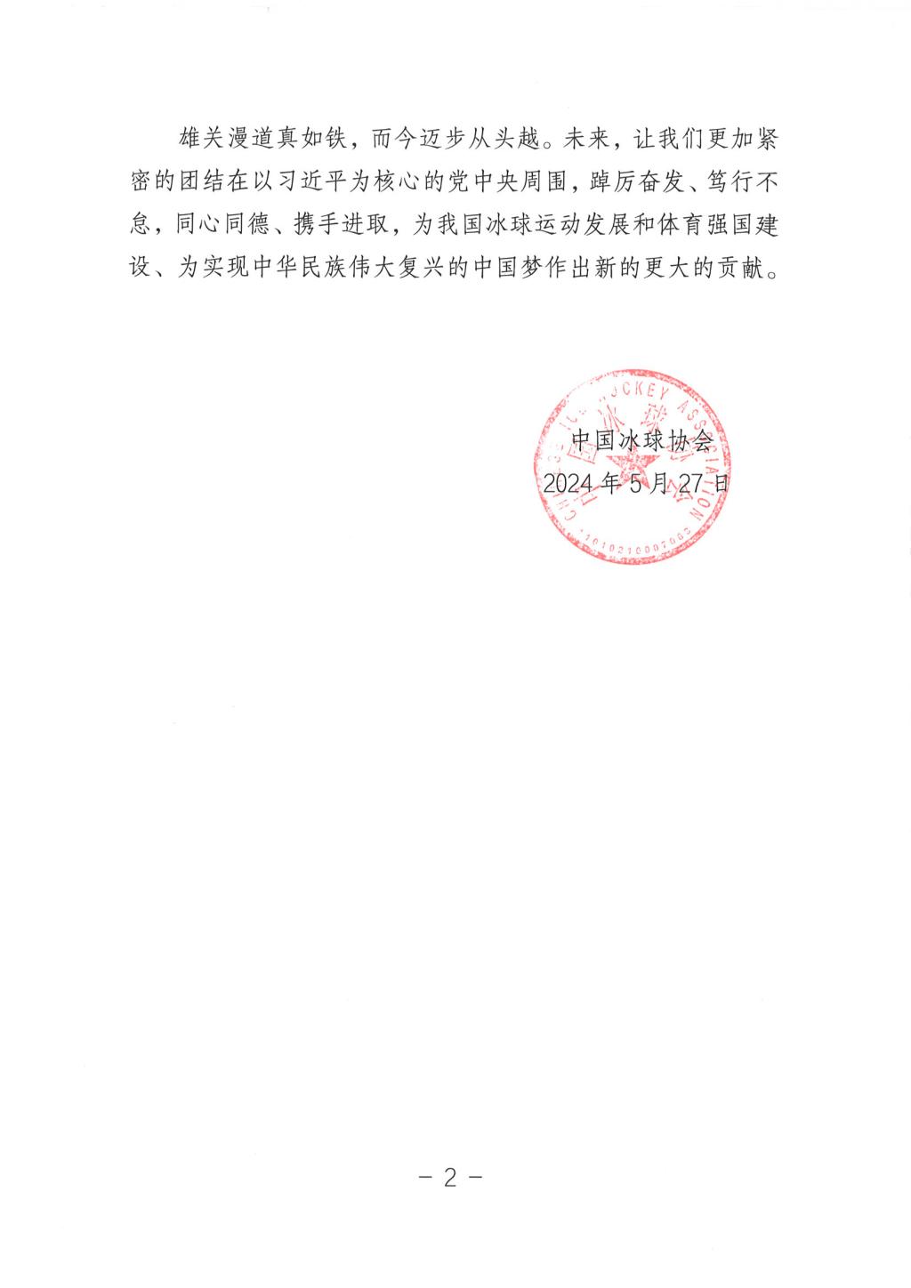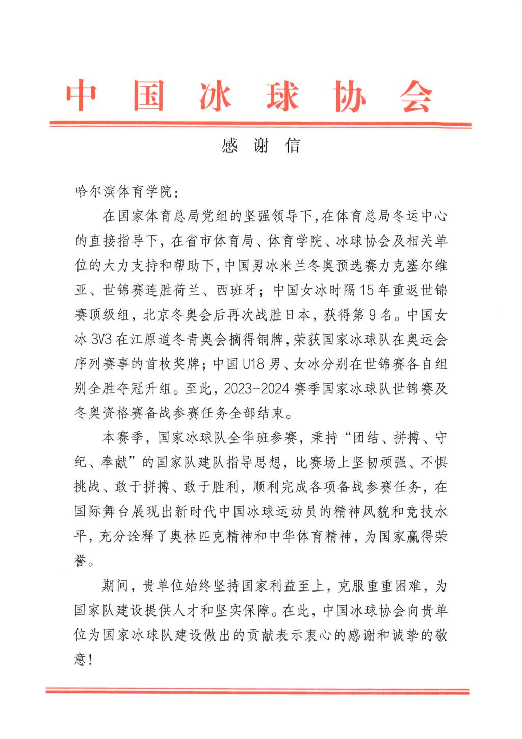 中国冰球协会向我校致感谢信
