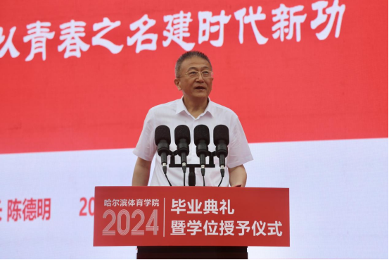 校党委副书记、校长陈德明以《赓续奋斗,以青春之名建时代新功》为题为2024届毕业生送上祝福、寄予希望,向顺利完成学业、走向广阔舞台的全体毕业生表示热烈的祝贺。临别之际,陈德明校长向毕业生们提出三点希望:一是志存高远,在立志报国中勇毅前行。习近平总书记强调,“只有把人生理想融入国家和民族的事业中,才能最终成就一番事业”。希望同学们心怀“国之大者”、勇担重任,赓续哈体的光荣传统,以青春之我、奋斗之我为强国建设、民族复兴伟业贡献青春力量;二是脚踏实地,在笃行实干中成就未来。习近平总书记曾勉励广大青年:“要不怕困难、攻坚克难,勇于到条件艰苦的基层、国家建设的一线、项目攻关的前沿,经受锻炼,增长才干。”希望同学们干得了“苦差事”,扛得住“苦累活”,下得了“苦功夫”,在历经“苦其心志、劳其筋骨”的锻炼和“饿其体肤、空乏其身”的磨炼后百炼成钢;三是不懈奋斗,在加快推进体育强国建设中再建新功。希望同学们始终怀揣对体育事业的热爱和信念,做群众体育的健身指导者,青少年体育教育的传播者,竞技体育的引领者,科技体育的实践者,发扬中华体育精神,传播中华体育文化,解决体育科技领域关键性“卡脖子”问题,以真实、有效的作为为体育事业开辟新领域、新赛道,发展新动能、新优势,在加快推进体育强国建设中再建新功。