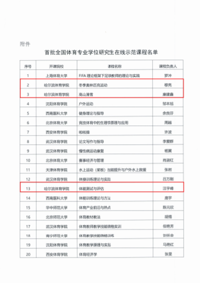 近日,全国体育专业学位研究生教育指导委员会公布了首批51门全国体育专业学位研究生在线示范课程,其中我校冬季奥林匹克运动、高山滑雪、体能测试与评估、体育课程与教学论4门课程获批。