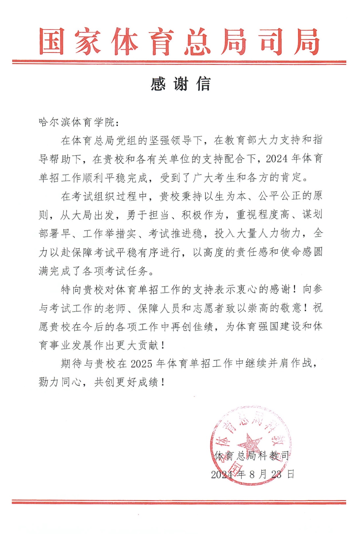 国家体育总局科教司向我校致感谢信