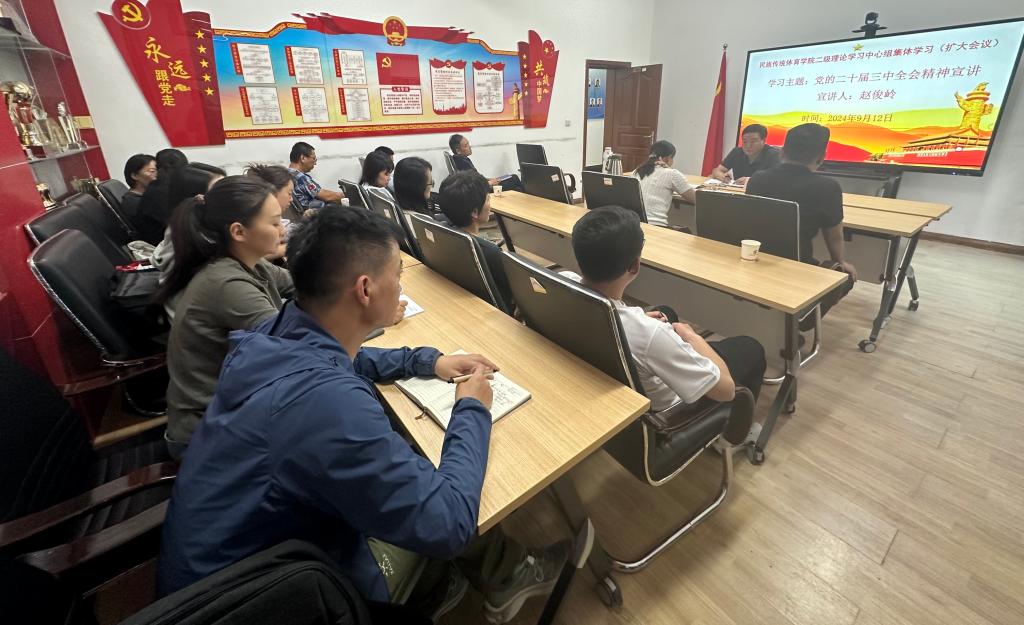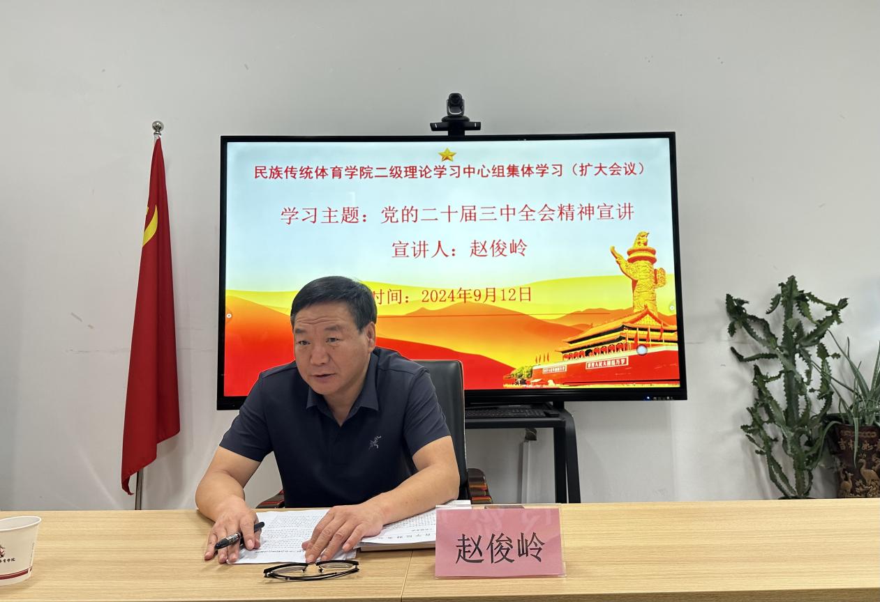 9月12日,校工会主席赵俊岭到民族传统体育学院进行党的二十届三中全会精神宣讲。宣讲会由民族传统体育学院党总支副书记、院长杨慧馨主持,学院全体教师参加会议。
