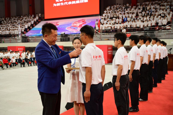 校党委书记兰景力为2024级新生代表赠书并佩戴校徽。