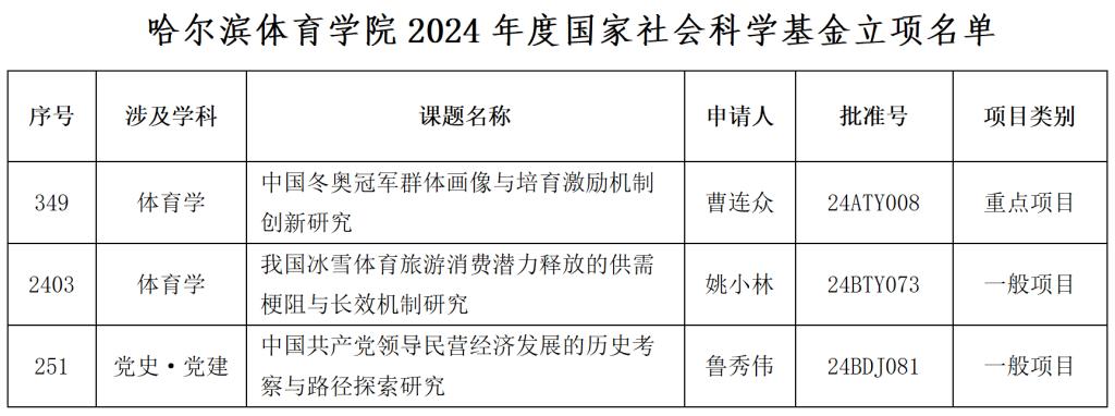 近日,全国哲学社会科学工作办公室公布了2024年度国家社会科学基金年度项目立项结果,我校共有3项获批,在立项数量和排名均实现历史突破。其中,副校长曹连众教授主持的《中国冬奥冠军群体画像与培育激励机制创新研究》获批重点项目,是我校首次获批国家社科基金重点项目,也是我省第1个体育学重点项目,具有里程碑意义。体育人文与社会学院姚小林教授的《中国冰雪体育旅游消费潜力释放的供需梗阻与长效机制研究》获批体育学一般项目,马克思主义学院鲁秀伟副教授的《中国共产党领导民营经济发展的历史考察与路径探索研究》获批党史党建一般项目,是我校首个非体育学项目。本年度立项数量在全国体育类院校位列第5名,在省属高校位列第3名。