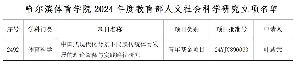 此外,我校民族传统体育学院叶威武博士的《中国式现代化背景下民族传统体育发展的理论阐释与实践路径研究》获批教育部人文社科青年项目。