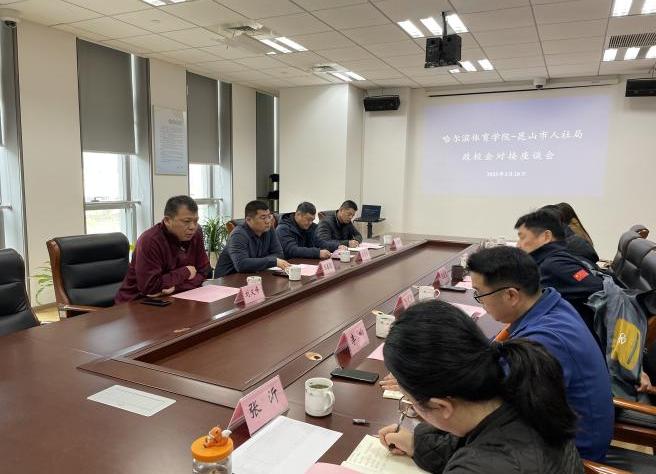 在昆山期间,校党委副书记王春雷集中带队走访昆山市人力资源和社会保障局等6家企事业单位,在哈尔滨体育学院—昆山市校地合作交流座谈会上,昆山市人社局党组成员、人管中心主任王建龙对王春雷副书记一行表示欢迎,并简要介绍了昆山市人才市场基本情况,他指出,双方合作具有极强的互补性,希望以此次来访为契机,围绕体育人才、文化旅游、冰雪产业等领域深化务实合作,力争形成更多合作成果。