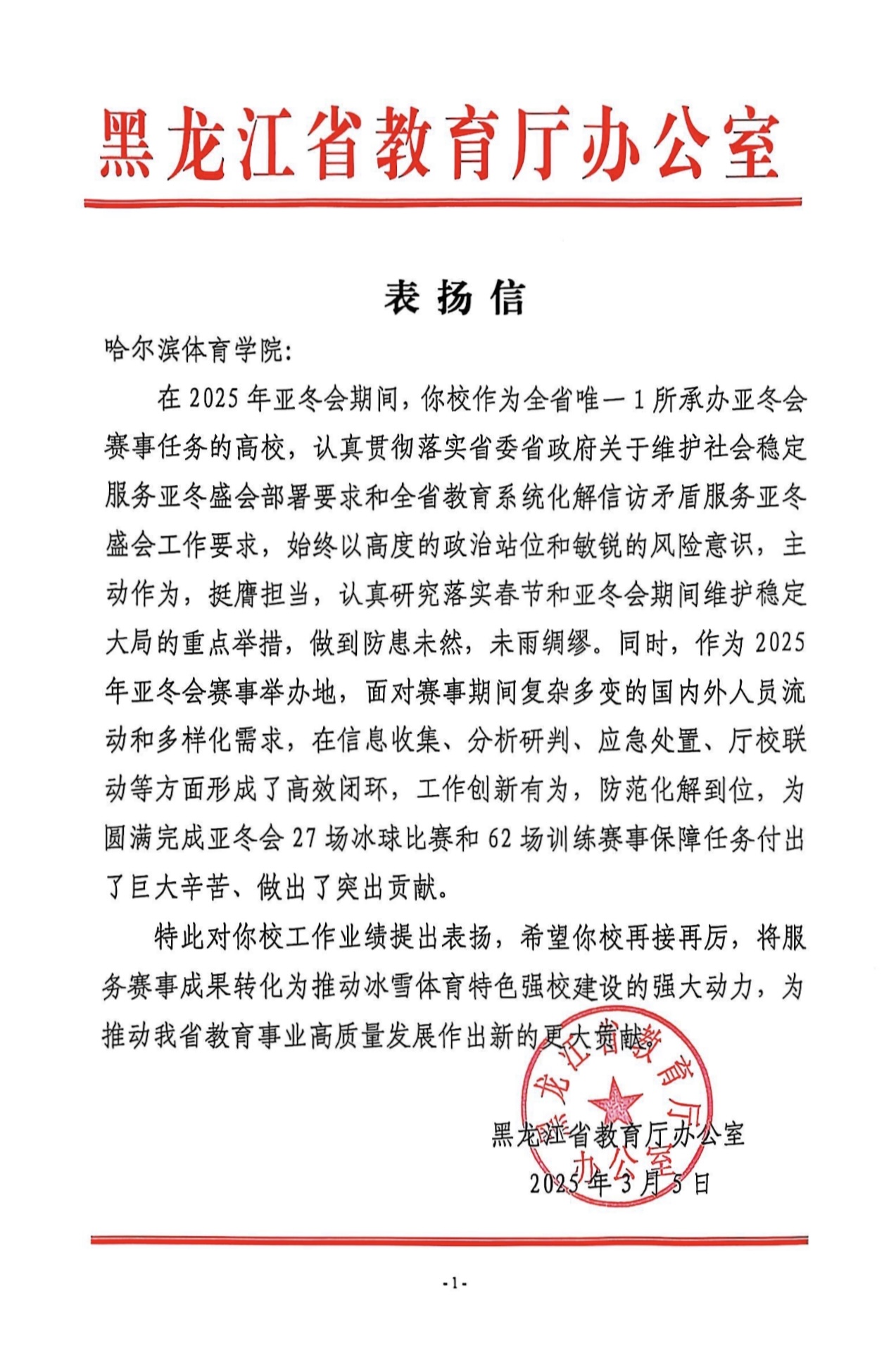 黑龙江省教育厅办公室向我校发来表扬信