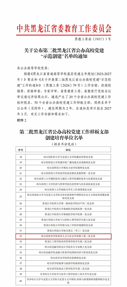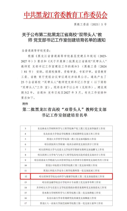 本次评选中,我校运动科学与健康学院教工第二党支部赵晨琼工作室获批第二批全省高校“双带头人”教师党支部书记工作室创建培育单位;体育人文与社会学院教工第二党支部获批第二批全省公办高校党建工作样板支部创建培育单位。成绩的取得充分展现了我校党建工作的良好成效,充分彰显了党建引领学校高质量发展的创新实践。