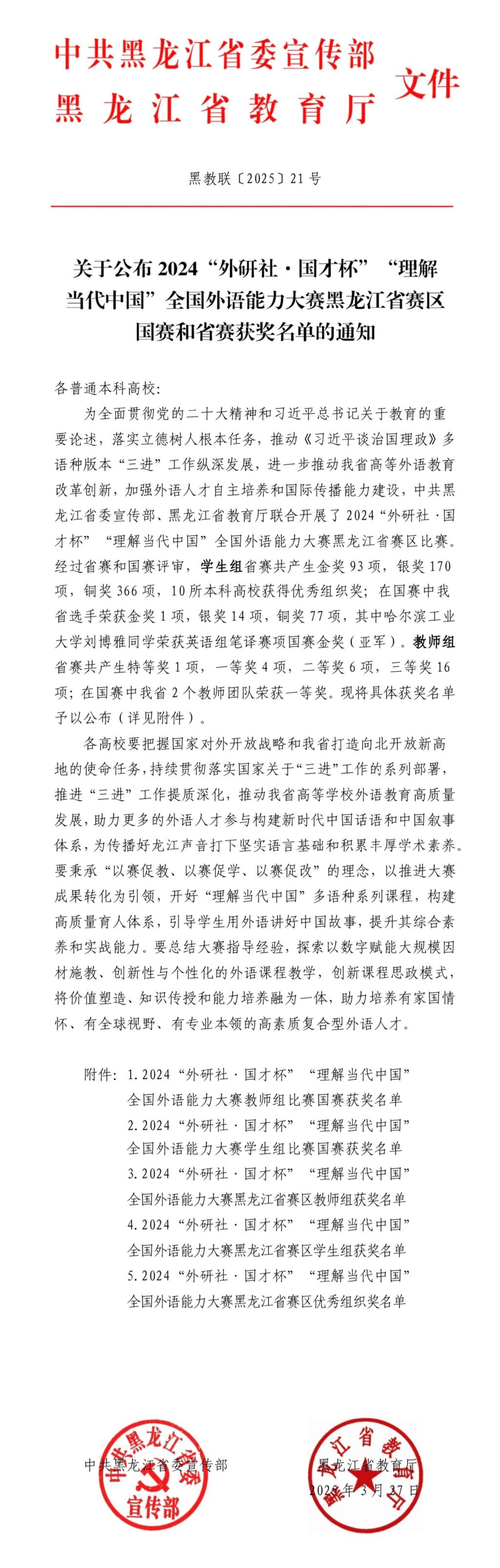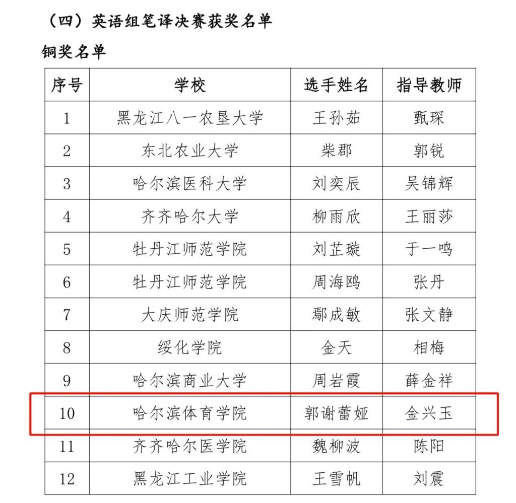 近日,黑龙江省委宣传部、省教育厅联合公布2024“外研社·国才杯”“理解当代中国”全国外语能力大赛黑龙江省赛区国赛和省赛获奖名单。我校共有6名同学获英语组奖项,其中,综合能力决赛银奖2人,铜奖1人;演讲决赛银奖1人,铜奖1人;英语组笔译决赛铜奖1人。