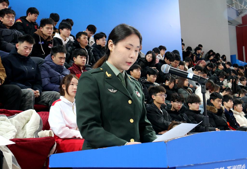 运动科学与健康学院2023级1班李羽彤发言。她曾服役于中国人民解放军陆军,“明者远见于未萌,智者避危于无形。”她呼吁,在全民国家安全教育走深走实十周年的新起点上,让我们坚定不移贯彻落实国家发展安全观,以实际行动为实现中华民族伟大复兴的中国梦筑牢安全屏障。