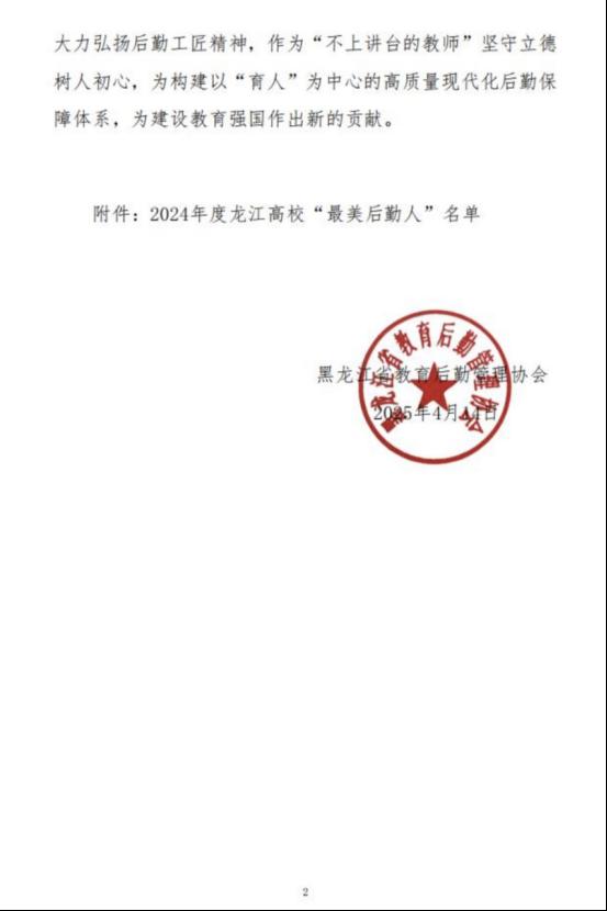 近日,黑龙江省教育后勤管理协会公布了2024年度龙江高校“最美后勤人”评选结果,我校后勤管理处常晶荣获2024年度龙江高校“最美后勤人”称号。