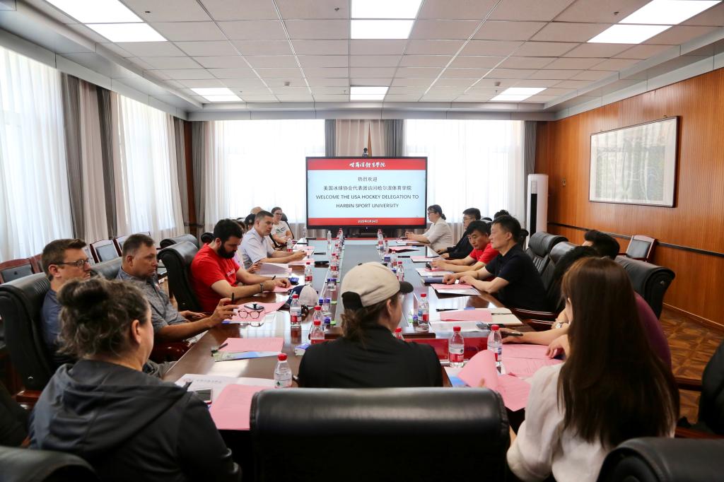 6月24日,美国冰球协会代表团在黑龙江省冰球协会会长邹亚昌、秘书长冯雷陪同下访问哈尔滨体育学院。双方围绕“深化冰球交流合作”主题举行座谈会并开展交流活动。哈尔滨体育学院副校长曹连众以及学校相关部门负责人孙大海、武大伟等出席会议。会议由学校国际交流合作处处长孙海丽主持。