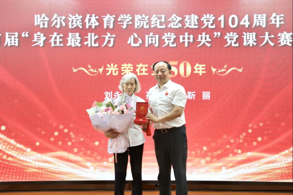 赛事结束后,学校党委为我校党龄达到50周年的离退休老党员代表——离退休党支部孙丽霞同志颁发了“光荣在党50年”纪念章,以此表彰老党员们五十载的奋斗历程和对党的无限忠诚。