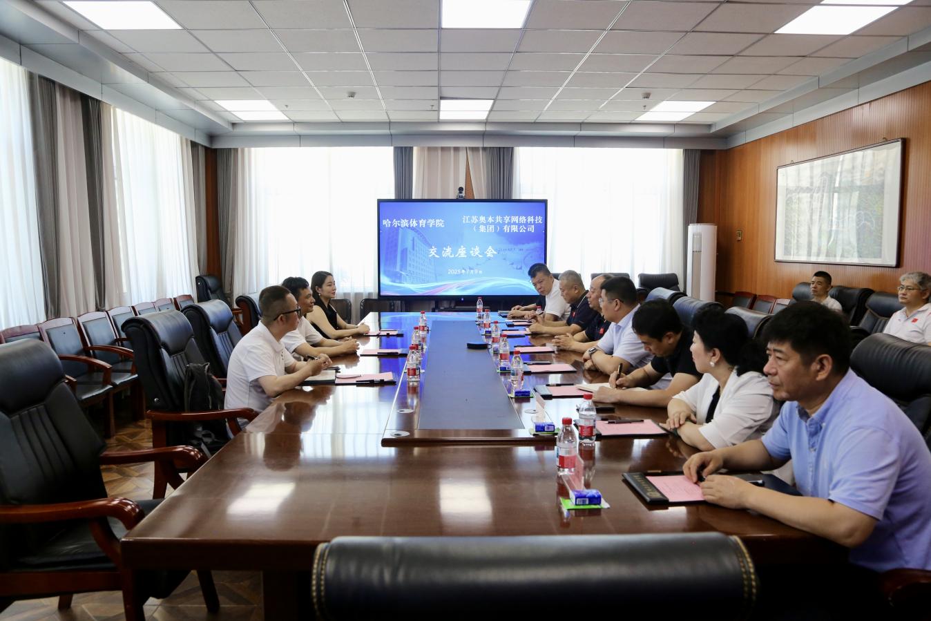 7月9日,哈尔滨体育学院与江苏奥本共享网络科技(集团)有限公司校企合作座谈会在学校崇德楼8楼会议室举行。校长姜玉洪,党委副书记王春雷,江苏奥本集团董事长冯春华,集团总经理、奥本品牌创始人崔欣,总经理特别助理、事业发展部部长常江及学校教务处、国有资产管理处、场馆管理中心、招生就业处、体育艺术学院相关人员参加座谈会,会议由党委副书记王春雷主持。