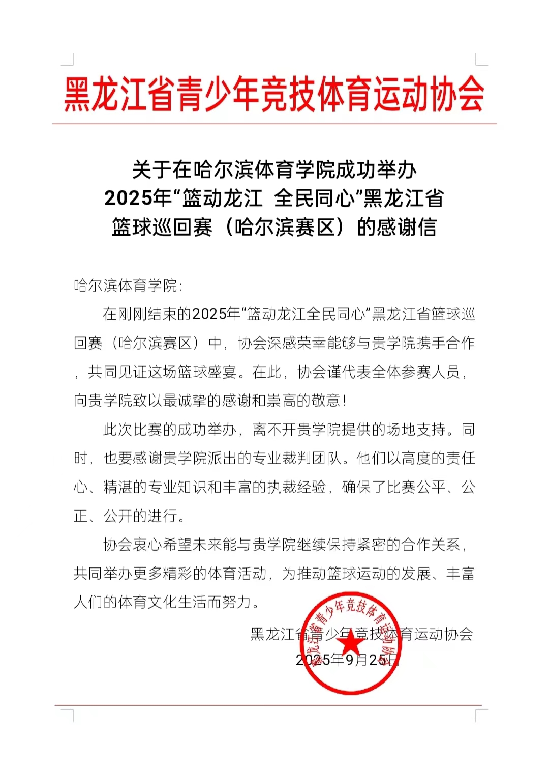 9月20日至21日,“篮动龙江 全民同心”黑龙江省篮球巡回赛(哈尔滨站)在我校篮球馆成功举办。本次赛事由黑龙江省青少年竞技体育协会主办,省社会体育指导与棋牌运动管理中心支持,系全民公益性篮球联赛。