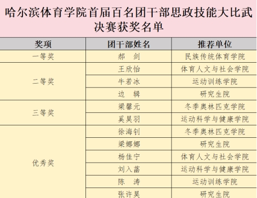 在本次活动中,研究生院团委、冬季奥林匹克学院团委、运动训练学院团委、运动科学与健康学院团委、体育人文与社会学院团委获得“优秀组织奖”;门光磊、秦文琦、禹晓萌、刘帅、陈欣、马闯被评为“优秀指导教师”。