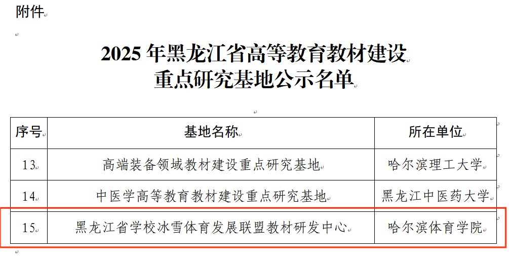 近日,黑龙江省教育厅公示了2025年高等教育教材建设重点研究基地拟认定名单。我校牵头申报的“黑龙江省学校冰雪体育发展联盟教材研发中心”成功获批,入选省级重点研究基地。