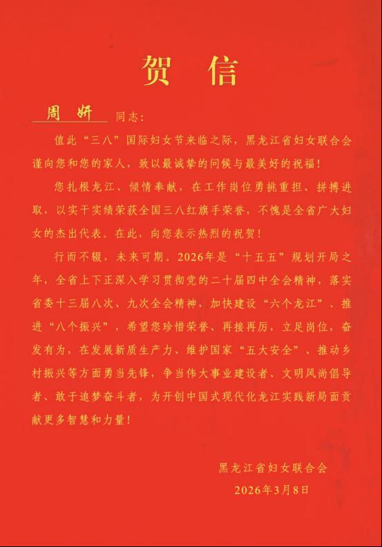 颁奖现场,刘畅代表省妇联向周妍表示热烈祝贺。她高度评价周妍深耕冰壶运动领域,从国家队优秀运动员转型高校体育教师,在竞技赛场为国争光、在教学一线潜心育人的突出业绩,勉励她珍惜荣誉、再接再厉,持续发挥巾帼模范带头作用,在体育教育与冰雪运动传承中展现新时代女性的担当作为。