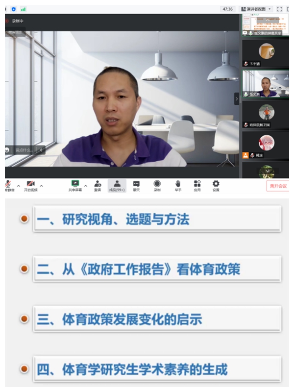 讲座开始前,王飞院长对张文鹏教授能够在百忙之中为学院师生进行讲座表示感谢,随后教师教学发展中心张彦秋副主任对张文鹏教授和会议内容进行了介绍。讲座中,张文鹏教授先后从学术研究视角和选题方法、《政府工作报告》看体育政策、体育政策发展变化的启示、体育学研究生学术素养的生成等四个方面进行了汇报。张文鹏教授强调,要跳出体育来看体育,从相关学科视角出发来做研究。要抓住我国体育政策发展变化的特征,总结改革开放以来体育政策的启示。处于研究生阶段的学生更应该时刻关注体育变化,重视学术素养的养成。做到“一个基础,两大视野,三项能力和四个坚持”。学术汇报结束后,部分师生就本次讲座主题与张文鹏教授进行讨论与交流。本次讲座持续了大约两个小时。