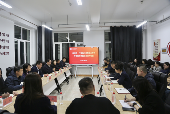 11月13日下午,为推进落实习近平总书记对学校思政课建设的重要指示精神,压紧压实本科教育教学审核评估工作任务,校党委书记兰景力、校长姜玉洪、副校长齐景嘉、高教研究与评估中心(教育督导中心)主任张彦秋,运动训练学院党总支书记那德福、院长吕吉勇、副院长马怡冰、副院长王俊及综合检查组秘书王博一行来到马克思主义学院开展教学质量综合检查。马克思主义学院班子成员、全体教师参加了此次检查工作。检查工作会议由马克思主义学院直属党支部书记白明主持。