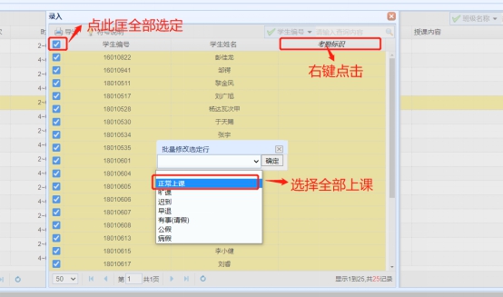 如果本次课没有学生缺勤,全部选定上课学生,然后右键点击“考勤标识”,选择“正常上课”即可。