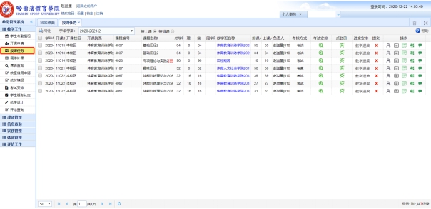 打开浏览器,在地址栏输入http://210.46.216.43/,账号为教师工号,初始密码为hty工号#。之后,首先点击左边菜单栏中中的“授课任务”,在 授课任务 界面 选择相应的学年学期等查询条件,系统列出授课任务,如下图所示。